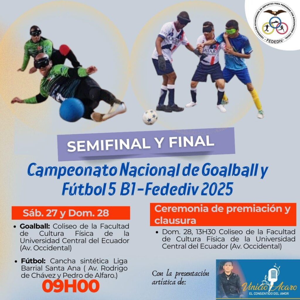 La Federación Ecuatoriana de Deportes para Personas con Discapacidad Visual (FEDEDIV) tiene el honor de invitar a los medios de comunicación y al público general a las jornadas decisivas del Campeonato Nacional de Goalball Femenino-Masculino y Fútbol 5 B1-FEDEDIV 2025 que se celebrarán el sábado 27 y domingo 28 de septiembre, con las semifinales el sábado y las finales el domingo, en ambas disciplinas.